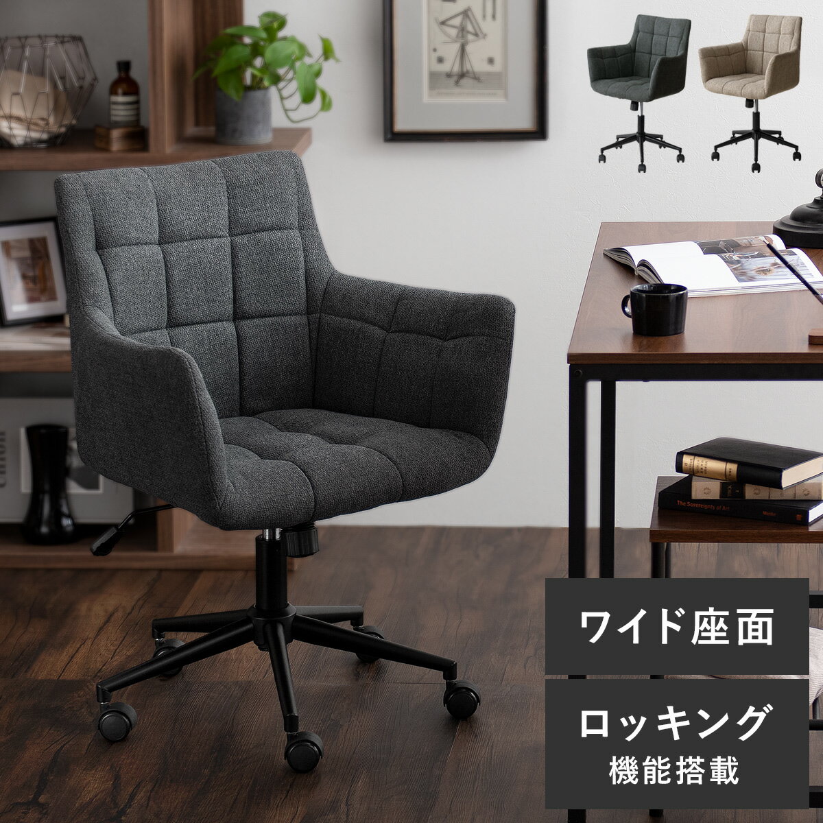 ガス圧昇降式・回転式座面・ロッキング機能・キャスター付きと快適な使い心地にもこだわったデスクチェアで、素敵で効率的なワークスペースを。