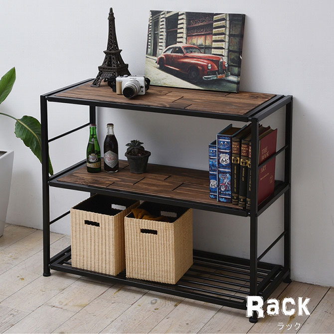 | ラック 「グラント」 幅90cm モザイク天然木 北欧 木製 オープンラック シェルフ 収納家具 ブラックスチール 収納棚 オープンシェルフ リビングボード ビンテージ調 アイアン おしゃれ アジャスター付 アンティーク調 オイル塗装 レトロモダン スタイリッシュ ナチュラル