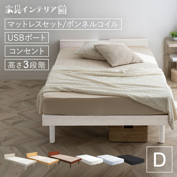 ベッド マットレス付き ベッドフレーム ダブル すのこ ベッド USB コンセント 棚付きベッド 【ボンネルコイルマットレスセット】 ベット ベットフレーム ダブルサイス 収納 マットレス付き 選べる ボンネルコイル
