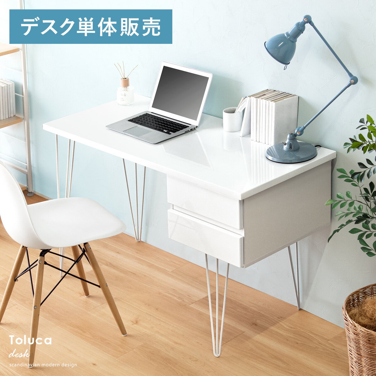 真っ白で統一されたモダンデスク“Toluca(トルカ)” 映り込みが美しい鏡面仕上げの天板や引き出し、スマートな脚部などシンプルデザインを引き立てるディテールが、洗練された素敵なワークスペースを演出いたします。