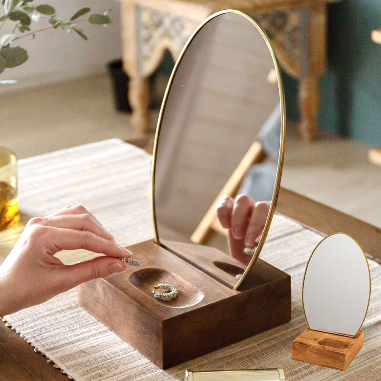 卓上ミラー オーバル型 真鍮フレーム 天然木台 角度調整対応 スタンドミラー 鏡 かがみ カガミ ミラー 卓上鏡 テーブルミラー アンティーク調 コンパクト 楕円型 化粧鏡 おしゃれ 可愛い メイクアップミラー シンプル インテリア雑貨 西海岸 [6690]