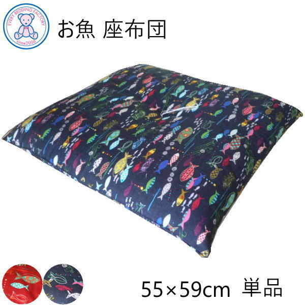 | お魚 座布団 銘仙判 55×59cm 日本製 綿わた100% 赤 紺 単品 1枚