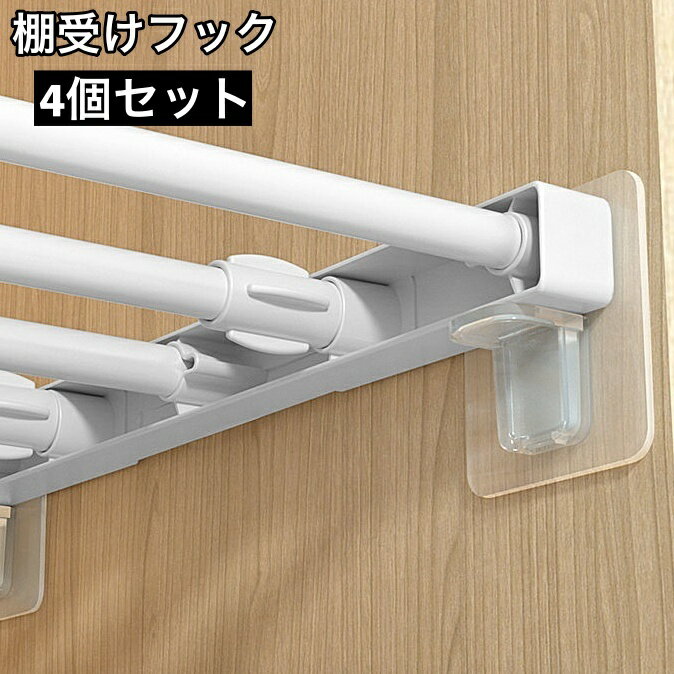 | 送料無料 棚受けフック 4個セット 粘着タイプ L型棚受け 収納家具用部品 クリア 透明 貼り付け 穴あけ不要 棚板追加 簡単 便利 棚受け部品 シール