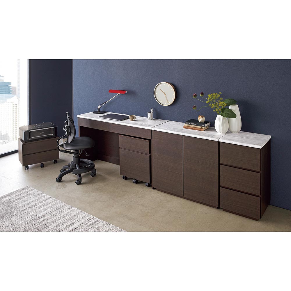 〜シリーズ展開〜◆デスク幅78・幅121cm◆扉収納幅78・121cm◆チェスト幅39.5cm◆サイドチェスト幅45.5cm◆プリンターカート幅50.5cm〜素材と機能〜◆天板には大理石の風合いをリアルに再現したマーブル模様の素材を使用。