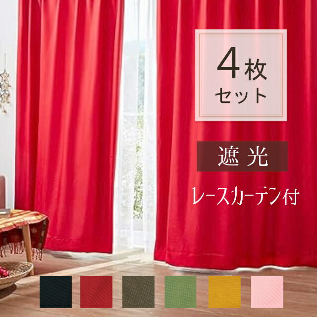 | <お買得4枚セット>洗える 3級遮光(裏地付)カラーカーテン レースカーテン付 シンプル インテリア ※幅200mは2枚セット(幅100cm~200m/丈90cm~230cm)レッド ピンク オレンジ ブラック 4色