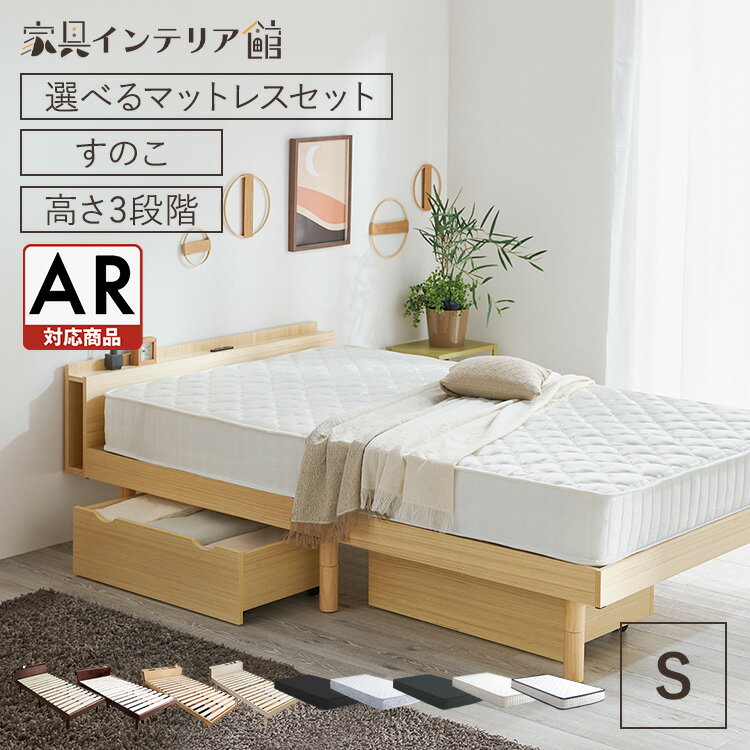 【20日最大P8倍】★楽天1位★ベッドフレーム シングル 宮付き すのこ ベッド シングル すのこベッド 高さ 3段階 調節可能 コンセント付きベッド 天然木 一人暮らし 宮 付き 脚 高さ調整 ハイタイプ マットレス付き マットレスセット マットレス フレームのみ 【AR対応】