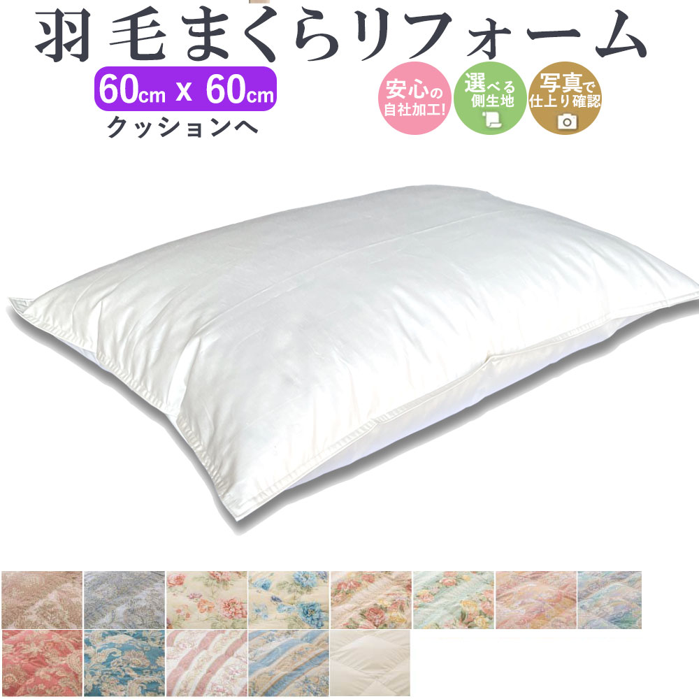 | 【マラソン限定P10倍&エントリーで+P10倍】【最短2週間】 羽毛枕 クッション リフォーム 60×60cm 綿100% l 打ち直し ホテル仕様 快眠 安眠 仰向け 側生地交換 寝返り いびき 横向き 肩こり 首こり ストレートネック 羽毛 枕 首枕 頚椎 ヘルニア まくらリフォ