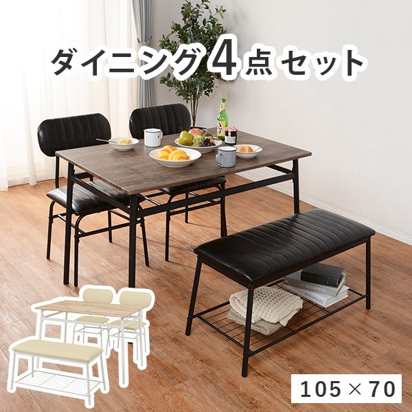 | ダイニング 4点セット テーブル 天板 70×105cm 木目調 チェア 3脚 ベンチ 棚付き 座面 ウレタンフォーム アイアン つや消し(代引不可)【送料無料】
