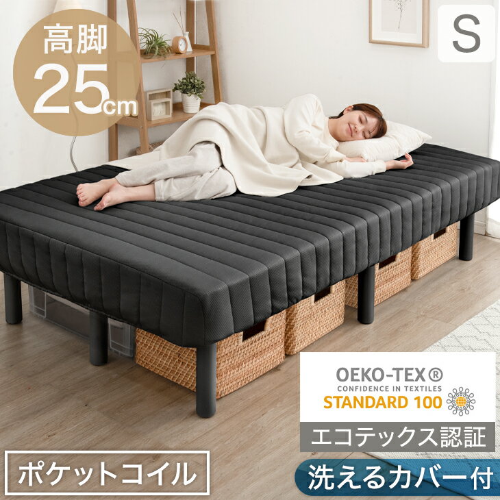 【正午~P5倍】 RENEW ワントーンデザイン 収納力UP!高脚25cm 洗えるカバー付 脚付きマットレス シングル ポケットコイル 洗えるカバー シングルベッド シングルベット ベッド 脚付ベッド 脚付マットレス 脚付き 足つきマットレス ハイタイプ 圧縮 一体型