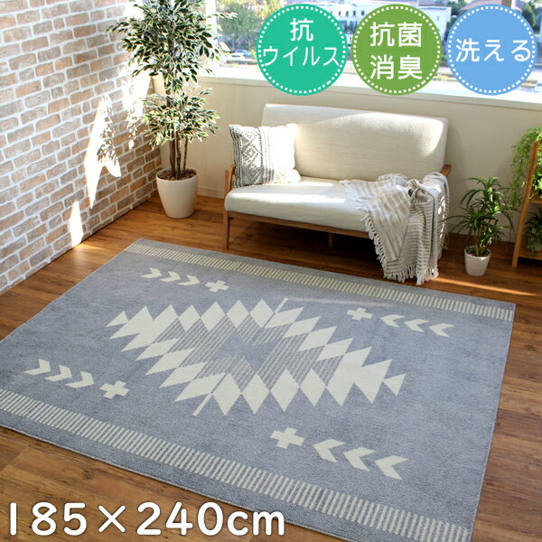 新商品 ラグ 洗える 北欧 おしゃれ 抗ウイルス 抗菌 消臭 防ダニ フォルス 185×240cm プレーベル 日本製 エスニック ネイティブ 床暖房対応 ホットカーペット対応 オールシーズン 長方形 P01 ラグマット 春夏秋冬用 ラグ グレー 秋冬