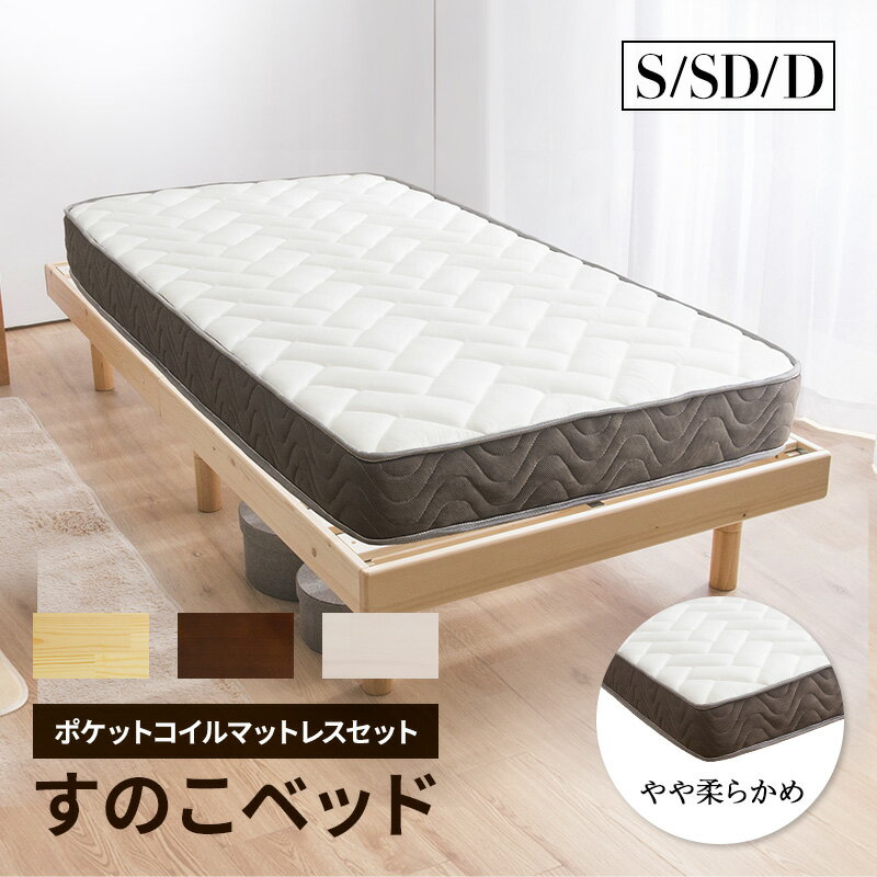 すのこベッド シングル セミダブル ダブル ベッド マットレス付き ベット ポケットコイルマットレスセット ヘッドボードなし 天然木フレーム 高さ3段階 北欧風 脚 高さ調節 木製ベッド フロアベッド スノコベッド コンパクト