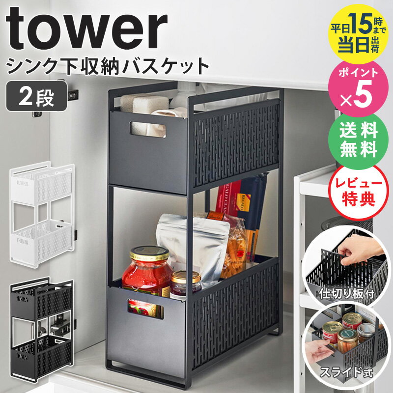【特典付き★】[即日発送] 山崎実業 シンク下収納バスケット 2段 タワー tower シンク下収納 スライド 引き出し シンク下 収納 スライドラック 収納ボックス キッチン収納 収納棚 調味料 ストッカー スリム シンク下収納ラック 隙間 ホワイト ブラック 5218 5219 公式 ordy